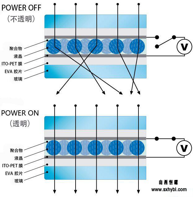 智能調光玻璃(lí)的調光原理是:在自然(rán)狀態下,它內部的液(yè)晶分子無規則地排列,液晶折射率比外麵聚合物的折射率低,入射光在聚合(hé)物層發生散射,呈(chéng)乳白色,即不透明。通電以後,彌散分布的液晶分子迅速從無規則排列變為定向有規則排列,使液晶的(de)折射率與聚合物的折射率相等,入射光可以通過,形成透明狀態。不透明與透明兩種狀態可以在瞬間內隨意(yì)轉換。